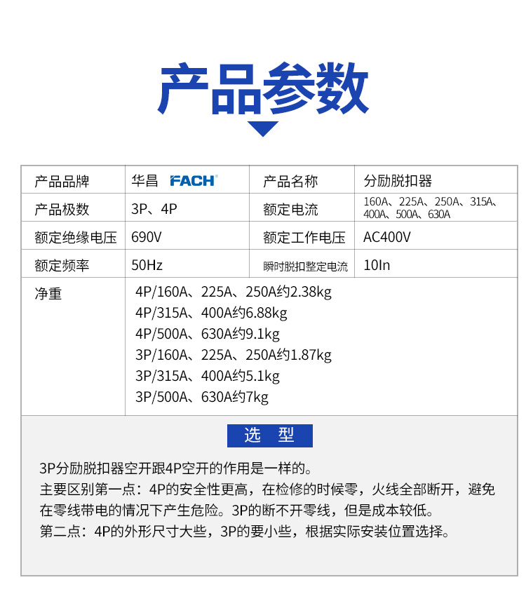 (3)4P和3P分勵脫扣斷路器的電流范圍:160A、200A、 225A、250A、315A、400A、500A、630A、800A等
